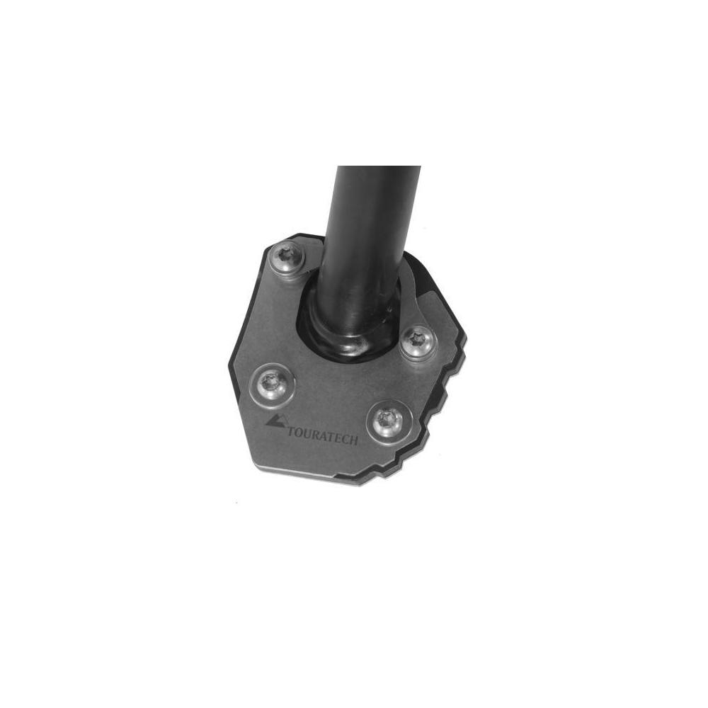 Touratech tiene la solución: La ampliación del soporte del caballete lateral aumenta a más del doble la superficie de apoyo. Los esfuerzos hercúleos para levantar en vilo la máquina totalmente cargada ya son solo un (mal) recuerdo. Esta ampliación combina el acero inoxidable y el aluminio negro anodizado, que no solo le confieren una estabilidad total, sino también una imagen increíble. La ampliación del soporte del caballete lateral, al ir montada fija, siempre está allí cuando se la necesita. Este accesorio tan útil le ahorrará muchos disgustos y malos ratos.